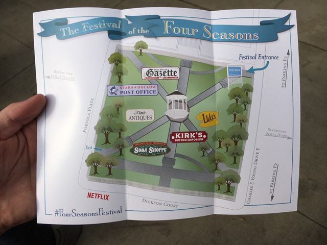 Konaný byl přímo Netflixem, který na místo dovezl i kulisy a nejrůznější věci z natáčení. Návštěvníci se tak mohli projít po Stars Hollow, posedět v altánku, dát si Lukovo kávu, přecpat se cukrovinkami z Taylorovy cukrárny, nesahat :) na starožitnosti u paní Kim, koupit si Kirkovy odznáčky (ano, Kirk má další práci) nebo se třeba opít slavným punčem slečny Patty. :)